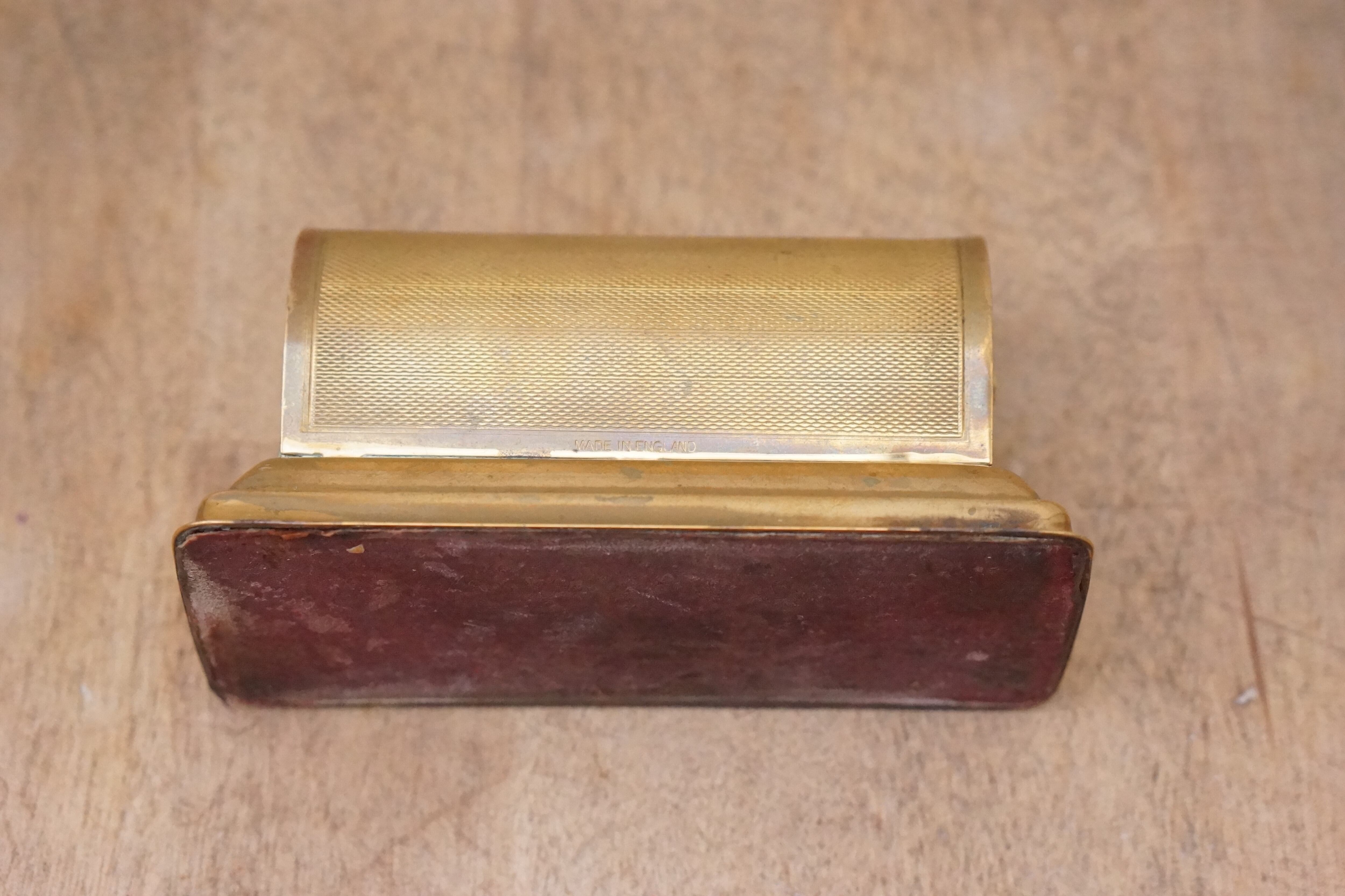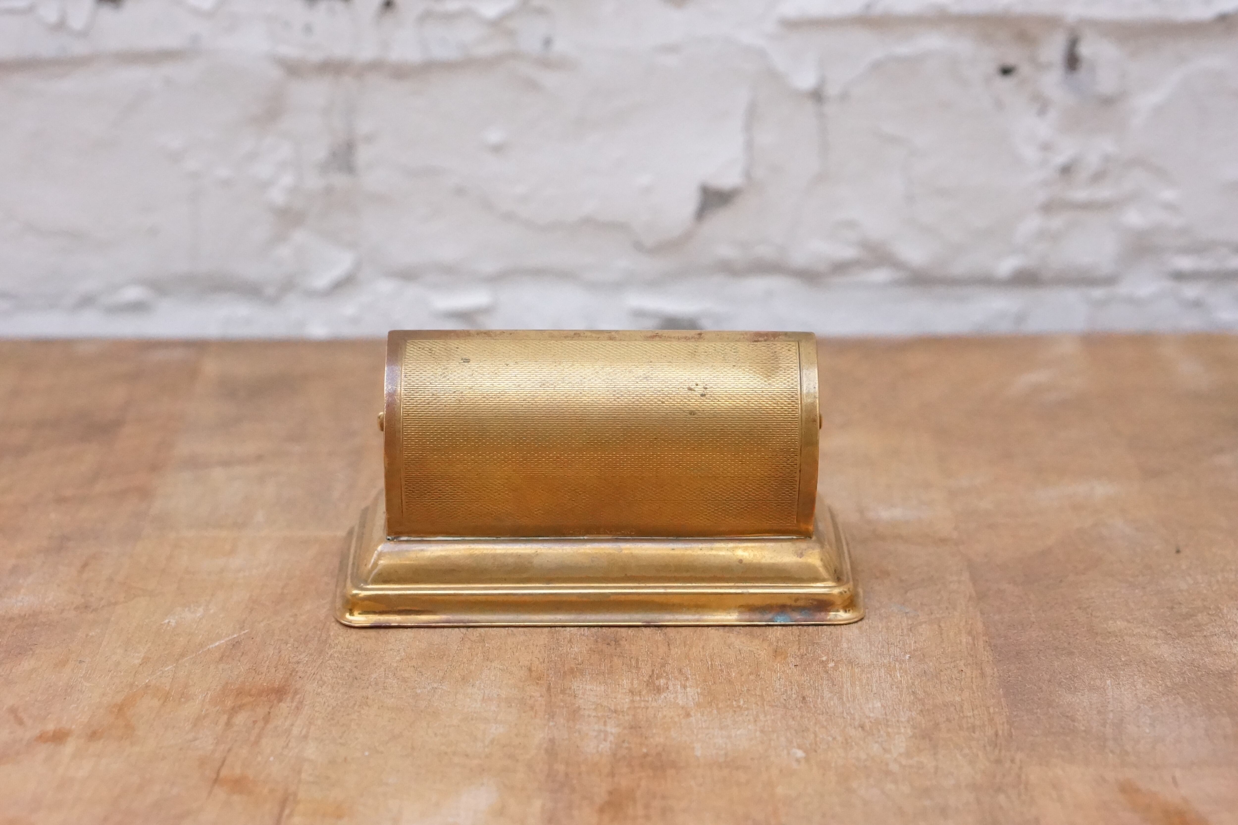 ダークブラッシーゴールドカラーのエンジンターンドメタルで作られており、どんな机やテーブルにも映えるでよう。