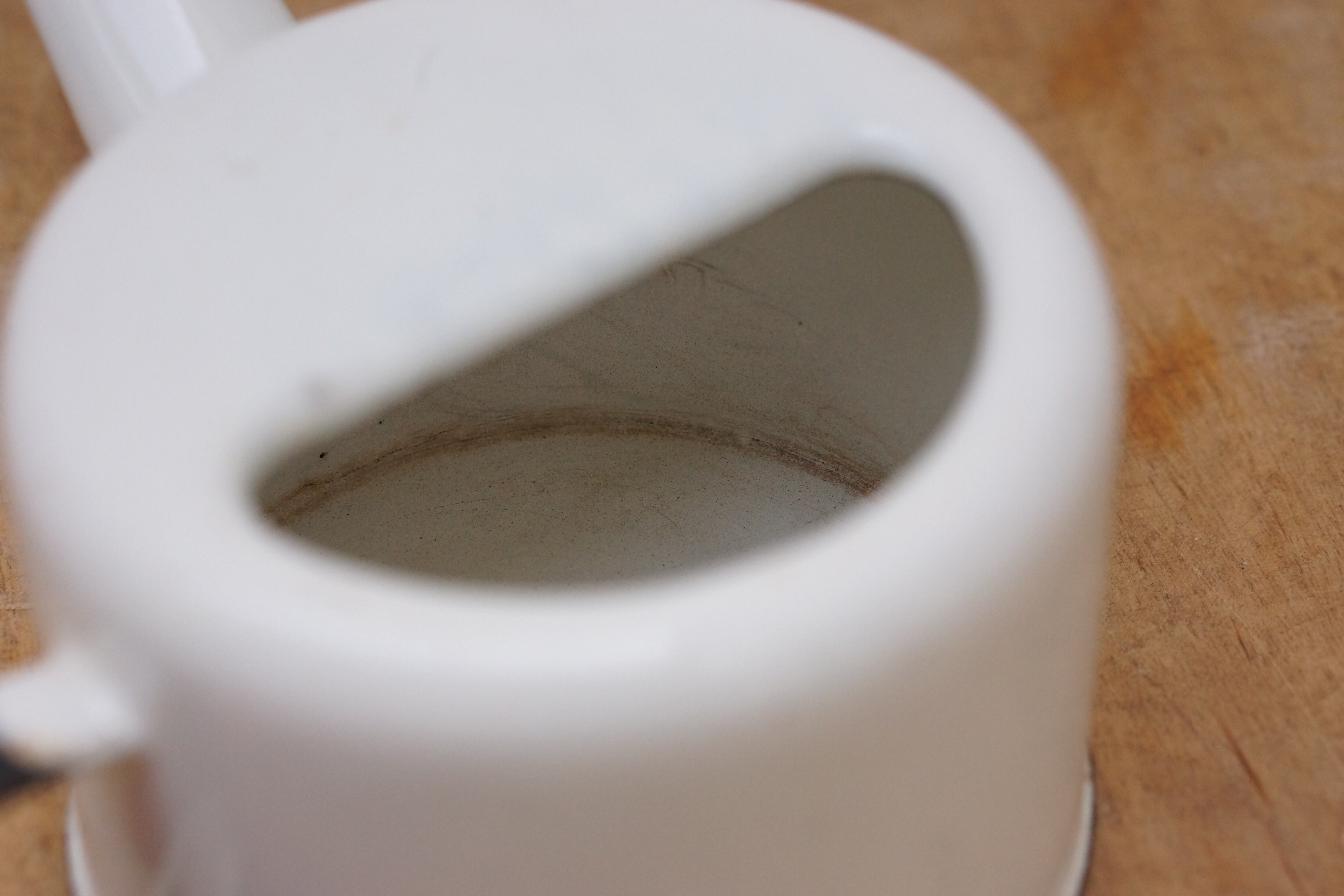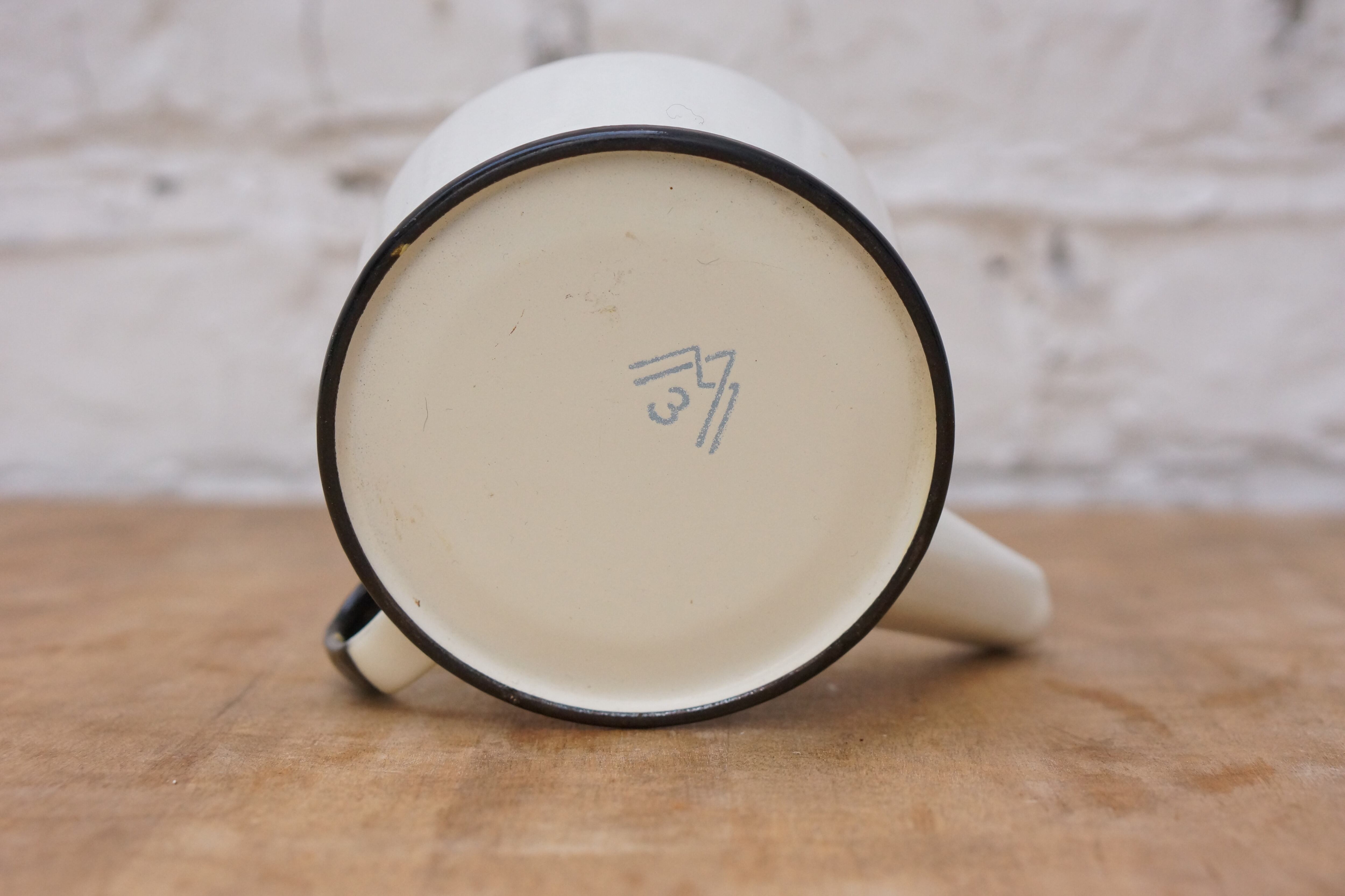 注ぎ口とハンドルが付いたヴィンテージのホーローマグカップ。