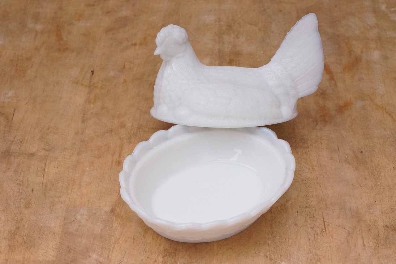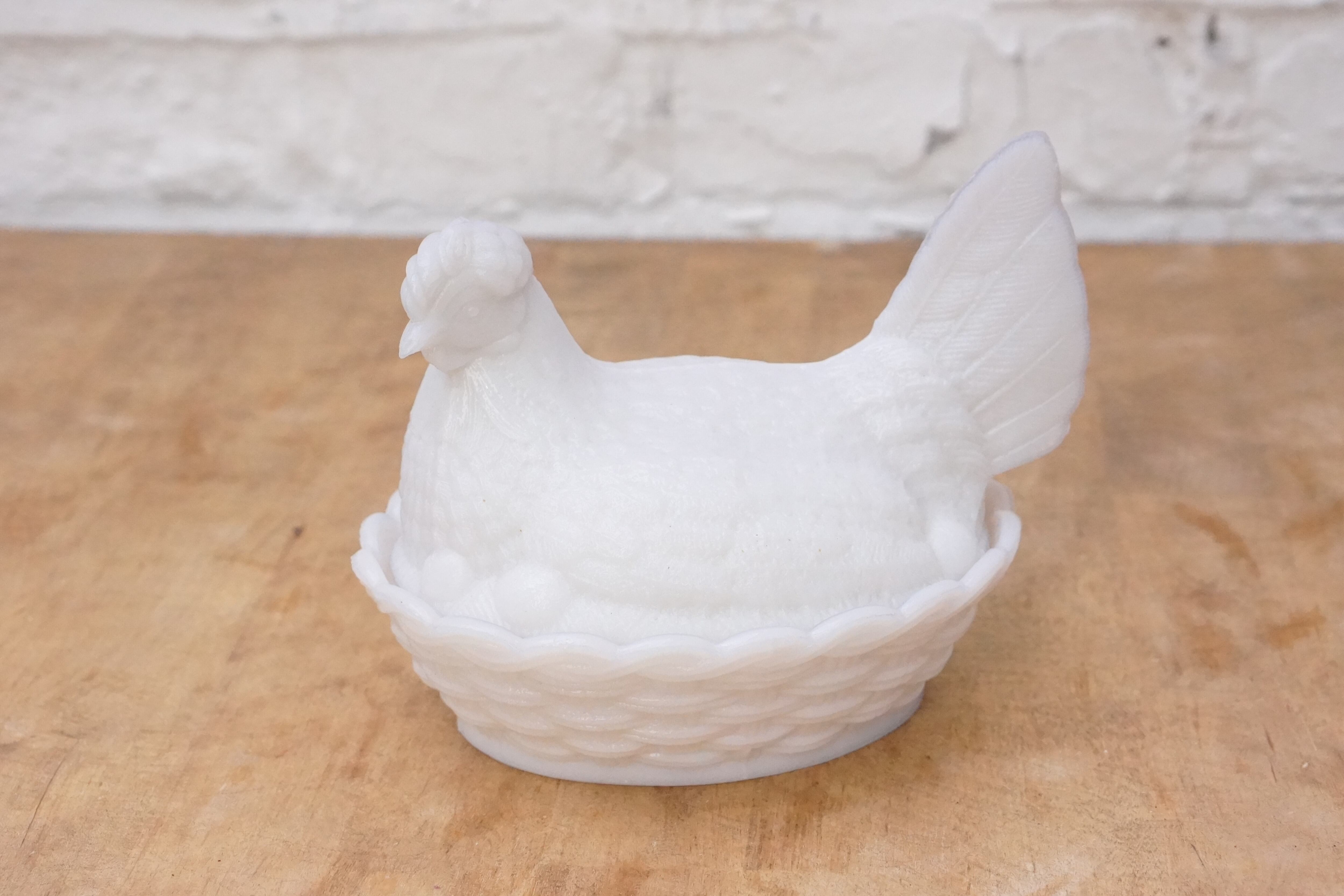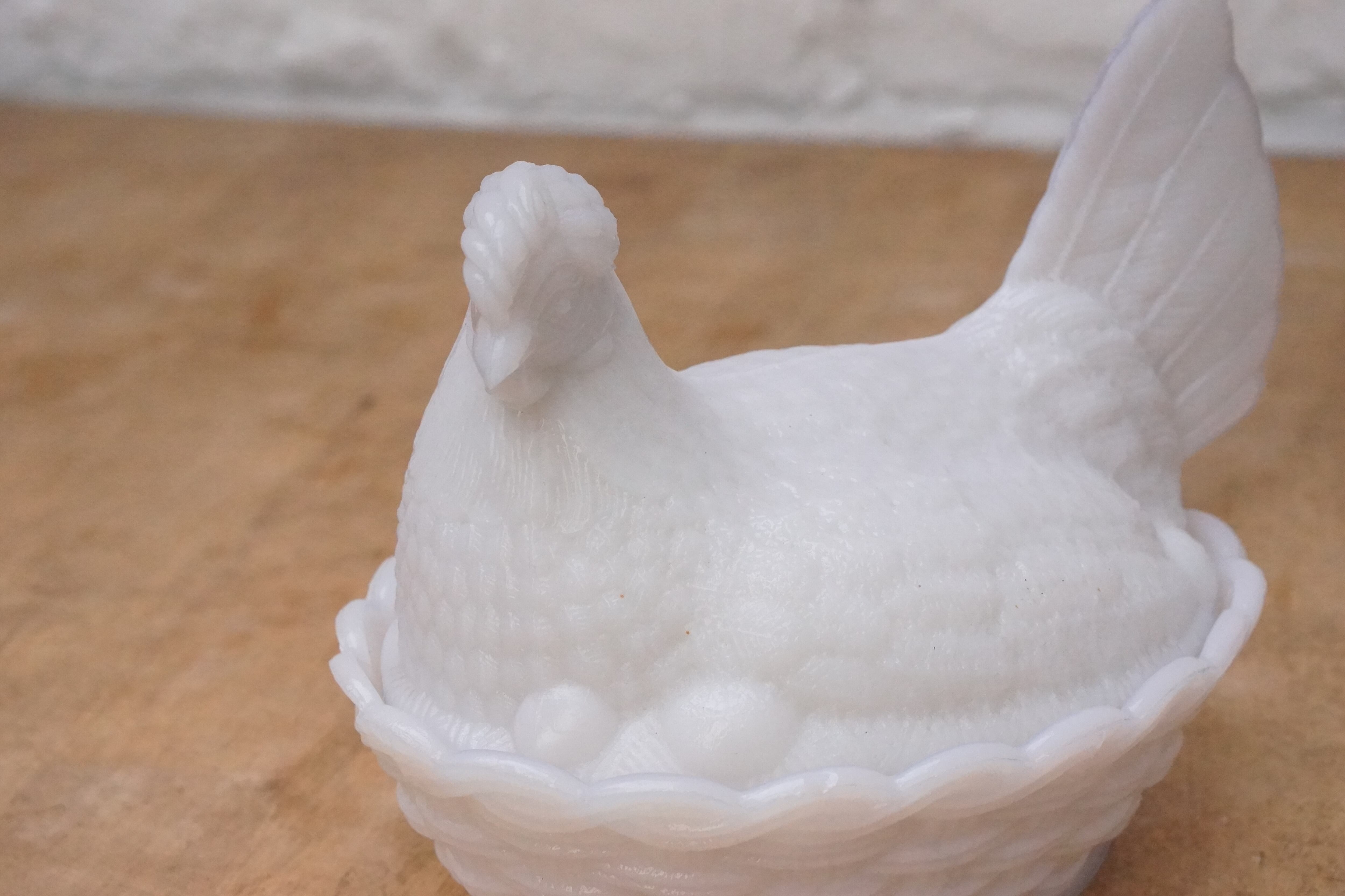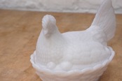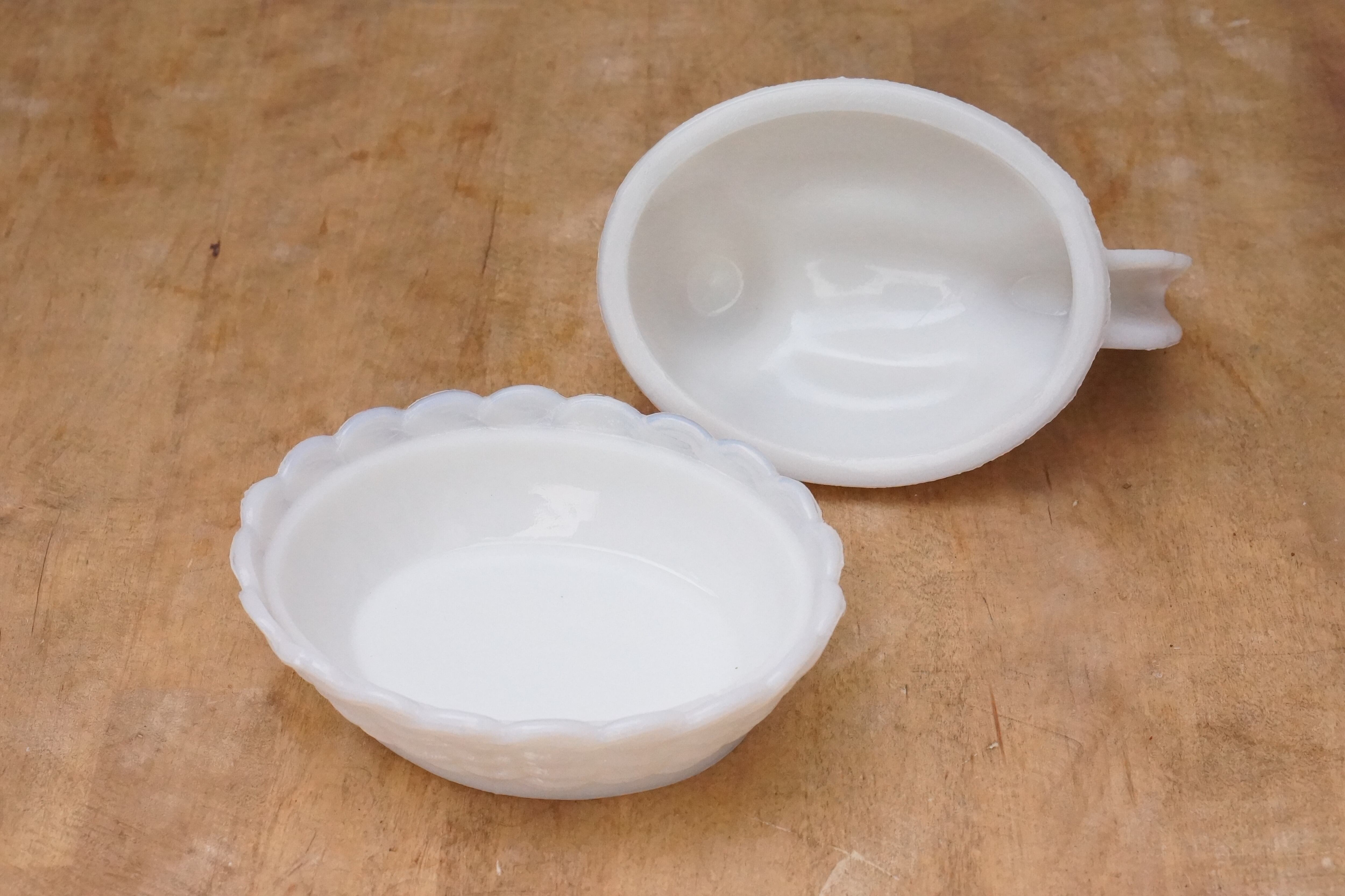 バスケットの巣で卵を守る母鶏のバターケース ミルクグラス製 1960年頃