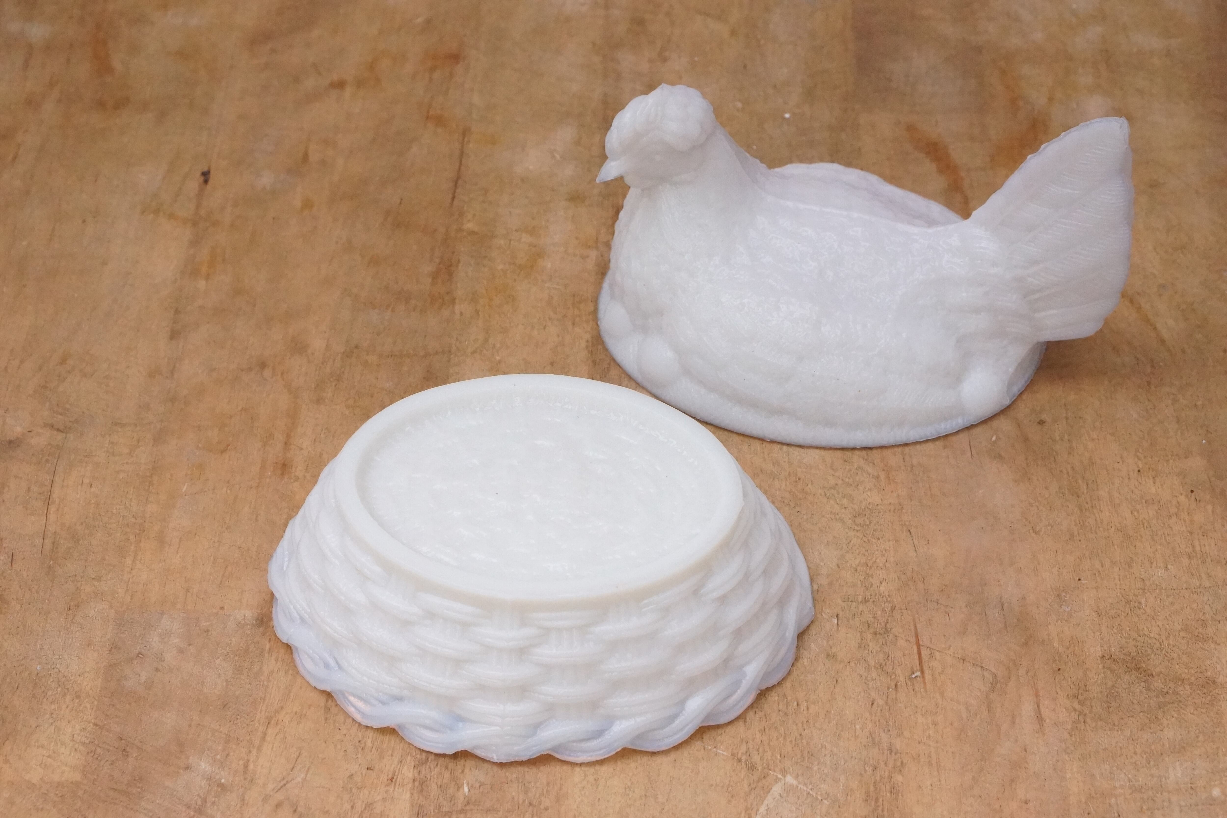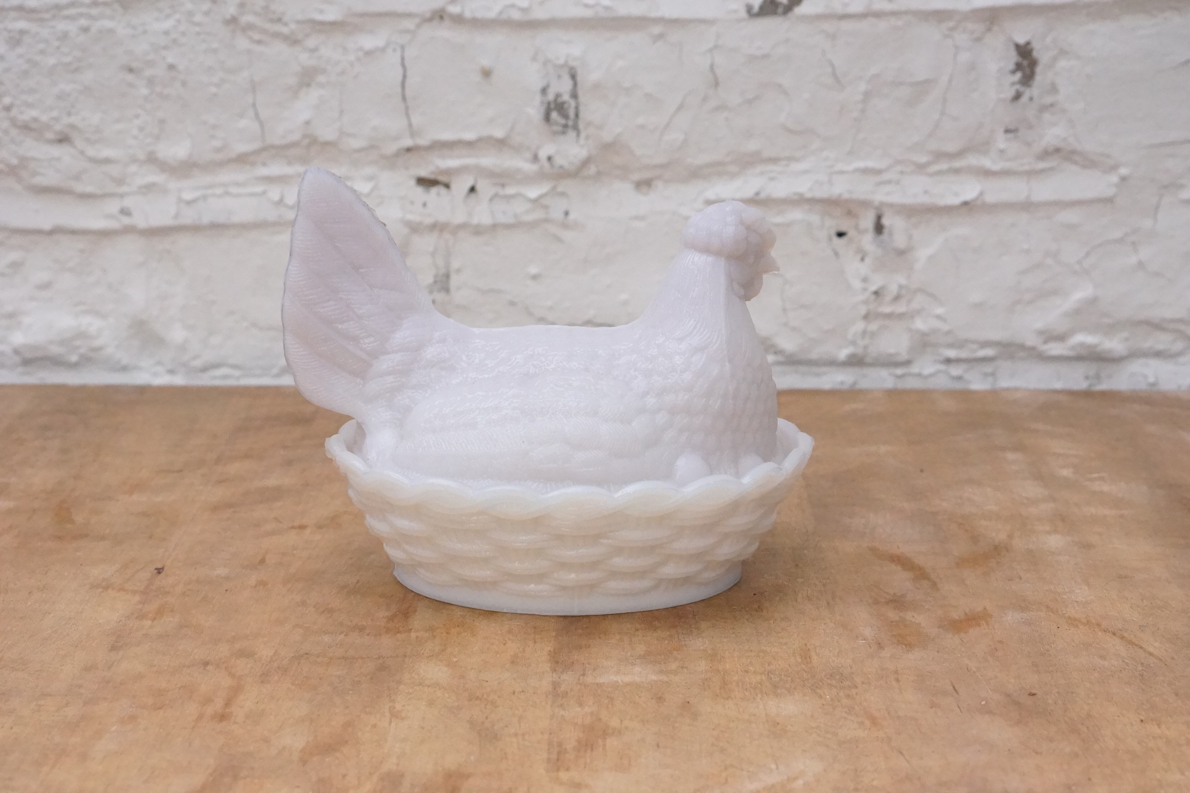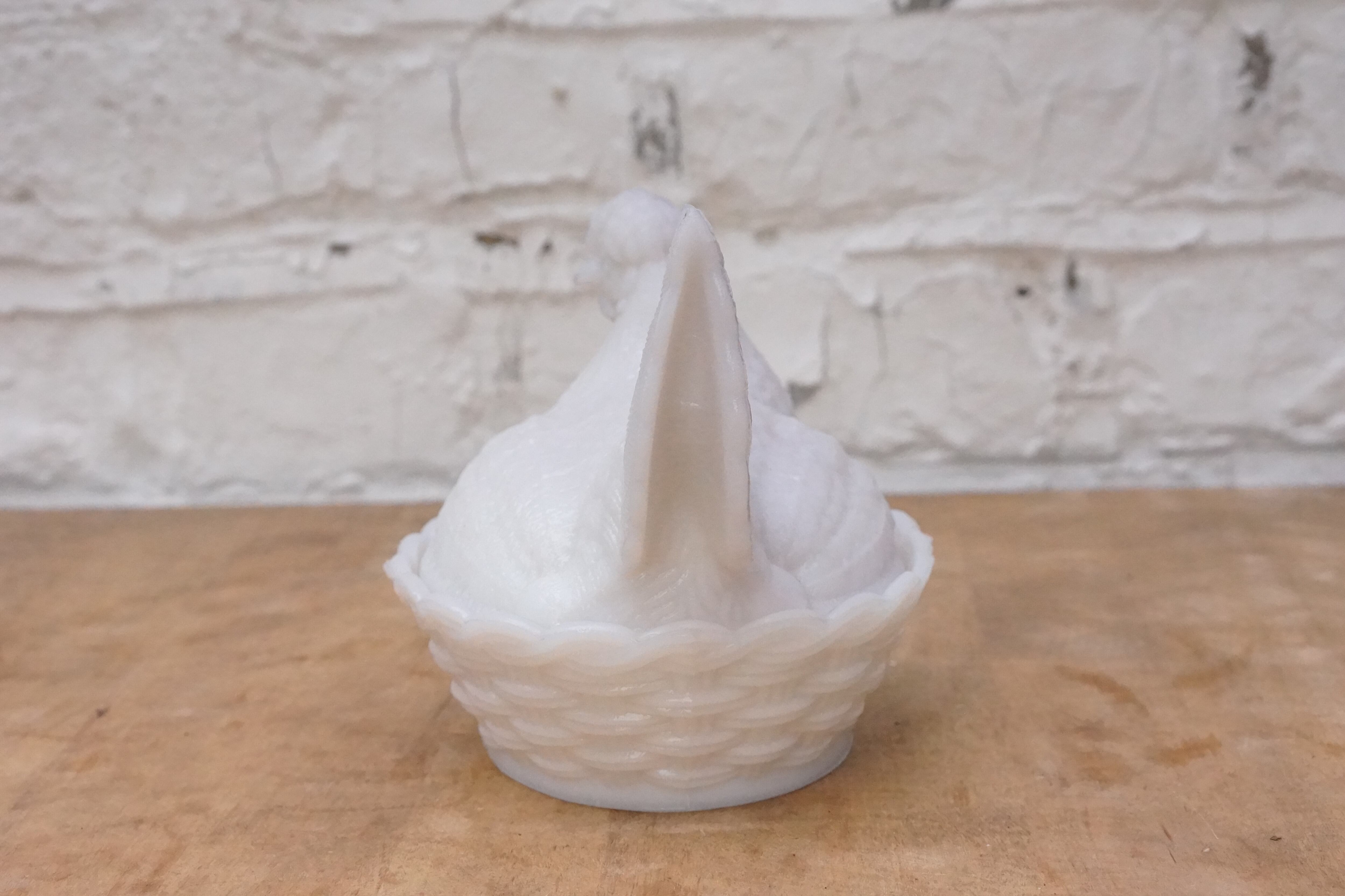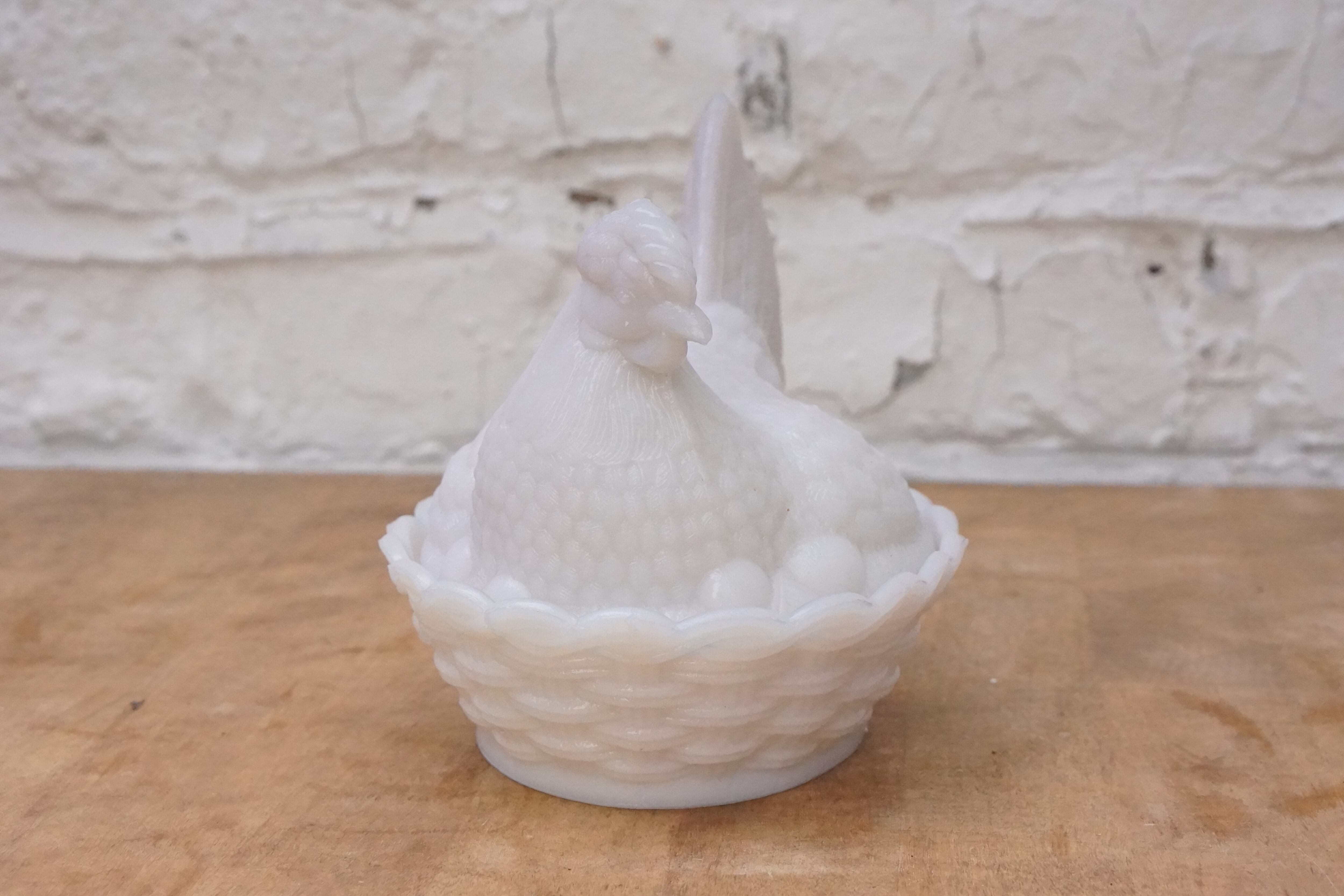 バスケットの巣で卵を守る母鶏のバターケース ミルクグラス製 1960年頃