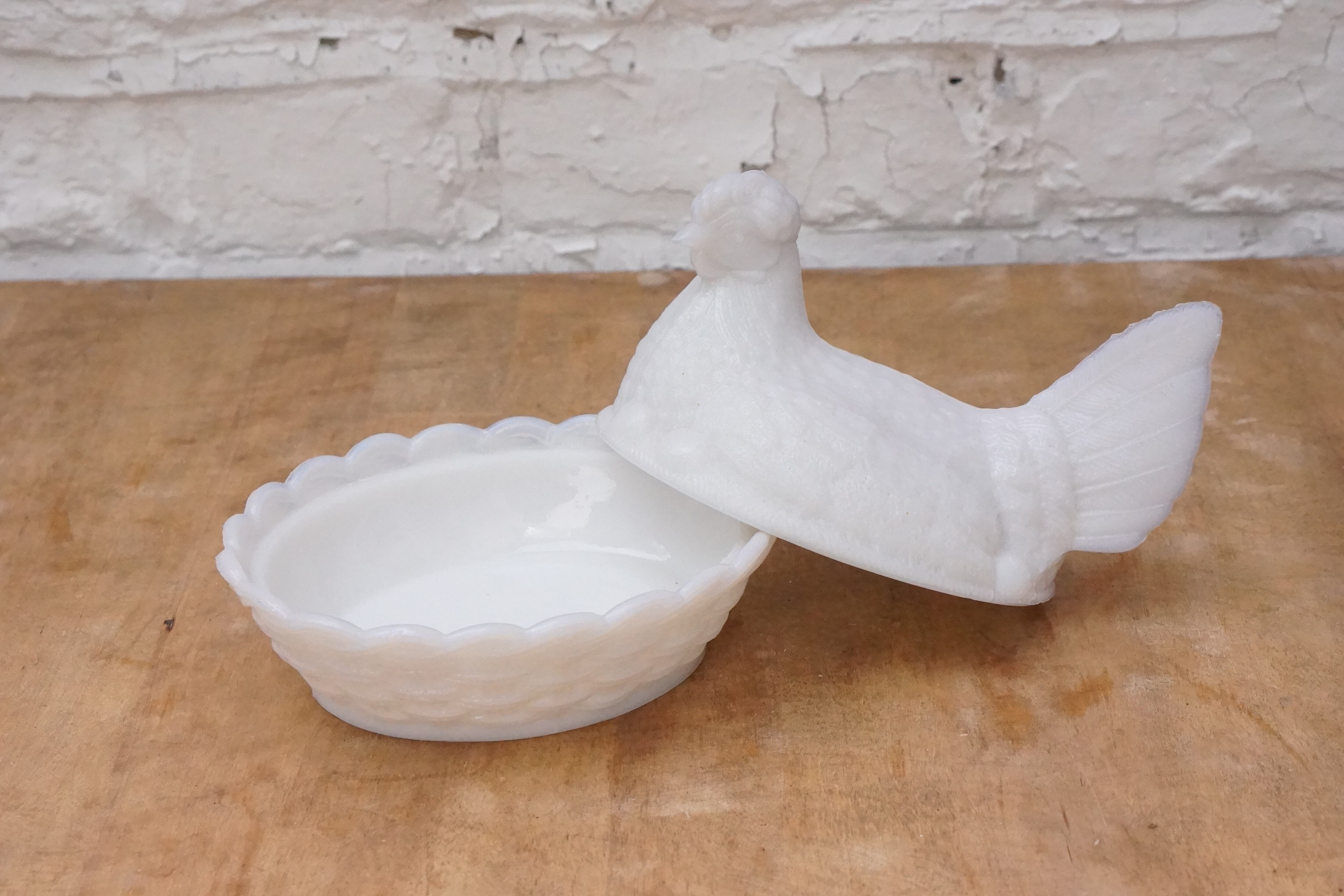 【Milk glass hen butter pot 1960S /バスケットの巣で卵を守る母鶏のバターケース ミルクグラス製 1960年頃】